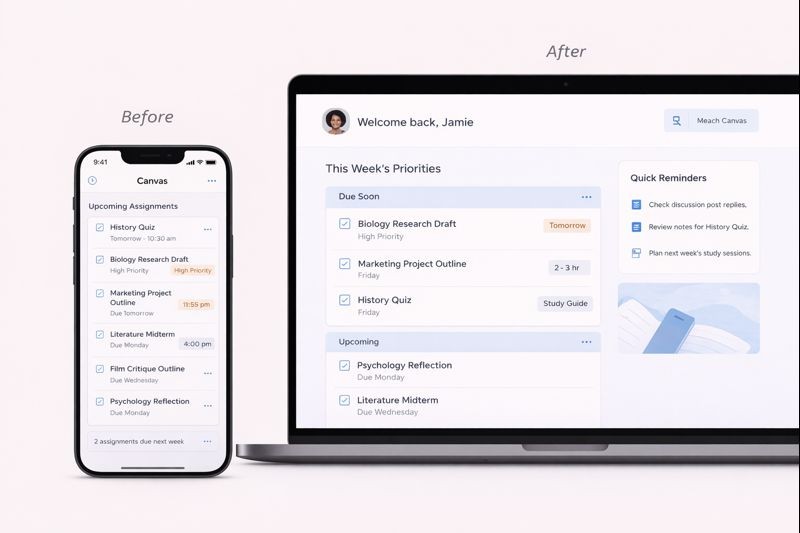 Learning management systems function as the primary control center for students navigating coursework deadlines assignments and expectations across multiple classes. While platforms like Canvas provide access to information they often fall short in helping students mentally organize that information in a way that supports focus confidence and emotional regulation. This project examines how cognitive overload and deadline anxiety emerge not from workload alone but from ambiguity unclear prioritization and fragmented signals across the system. The goal was to explore how Canvas could better support students in understanding what matters now what is coming next and how to act without constant checking or stress.